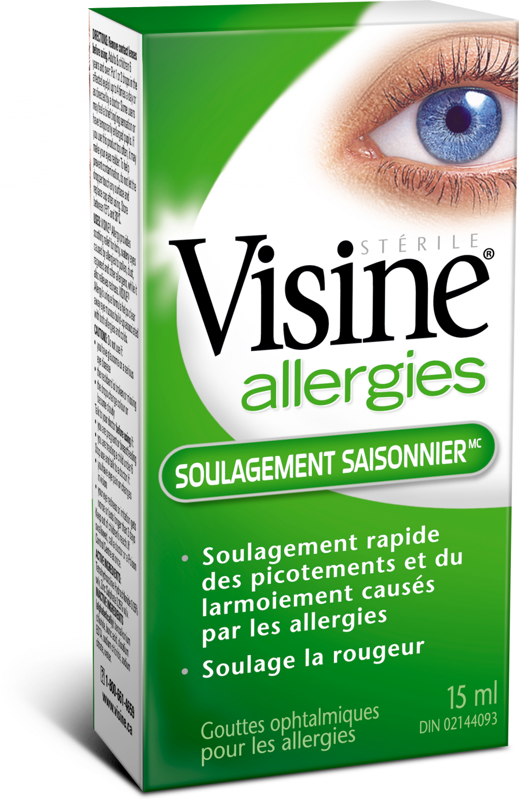 Contient un décongestionnant pour un soulagement efficace du larmoiement et des picotements et de la rougeur oculaires causés par les allergies au pollen, aux arbres, aux plantes herbacées, à l’herbe à poux, à la poussière, aux animaux et à la moisissure.
